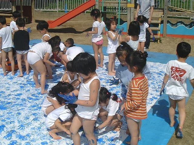 今日はこいのぼり製作の日でした。太陽の日差しがとても強く、肌にジリジリと焼けていくようでした。運動場に広げられた大きな真っ白の紙が、太陽の光に反射してとても眩しくて目が開けられない程でした。まず最初はこすもす組のクラスカラーである“ピンク”で色付けをしていきました。両手足にえのぐを付けて、ペタペタペタ…。みるみるうちに白い紙が、小さな子ども達の手型、足型で埋まっていきました。そして次に赤色を上に乗せ、最後はポイント色で黄色を付けました。しかしあまりにもの天気の良さに、えのぐも固まってしまい、最後の黄色はほとんど付かない状態でした。その為、こすもす組というよりも“ばら組”のこいのぼりみたいになってしまいました。こいのぼりが出来上がった時には、子ども達の体も全身“赤”や“ピンク”に染まっていました。みんながとてもよく頑張ったという証拠です。満足気に友達同士見せ合いっこしていました。新入の子ども達も初めての経験に大喜びで「すごく楽しかった〜!」と嬉しそうに話してくれました。あとはこのこいのぼりに“目”と“尾びれ”を作って完成です.玄関の所で大きなこいのぼり達が元気に空を泳ぐ日が楽しみです。 |