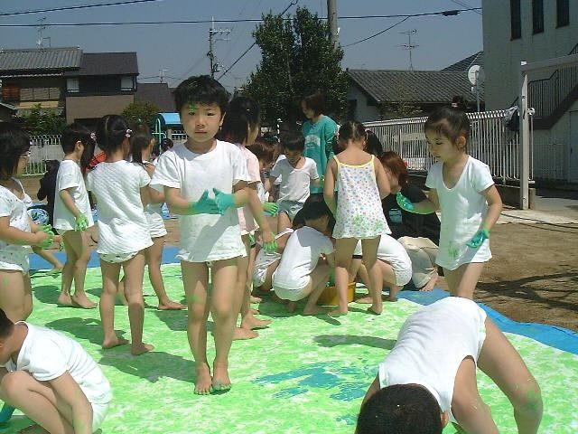 こいのぼり用の紙に、えのぐ遊びをしてきれいな色をつけました。汗ばんでくる程のいいお天気で、説明の時に白い紙のまわりに座っている子ども達は太陽の光が紙に反射して、それがとてもまぶしそうに顔をしかめていました。でも、子ども達の手をスタンプにしてペタペタと黄緑にぬっていくと、まぶしかったのが大丈夫になり、かわりに鮮やかな紙へと変身していきました。子ども達の小さな手なのでいくらたくさんいるといっても、なかなか全面に色がぬれませんので、「白いままのところは無いかな?」「白いところ発見!」などと声をかけながら私も一緒にぬりました。そうしていると、子ども達からも「白いところ発見!」と言いながら活動する姿も見られるようになってきて、ペタペタと根気よくていねいにぬってくれました。2色目・3色目と色を塗り足して、お花畑のようなきれいな紙ができ上がりました。飽きずにとても積極的に楽しんでいたために、知らず知らずえのぐの手が他の子に触れたりして、髪や服などに、えのぐの付いている子が多かったです。私も知らないあいだに背中や髪に付いていたり、ズボンにもいっぱい付いていたりしましたが楽しい活動の中で子ども達と同じ姿になっていたことが、なんだか嬉しかったです。 |