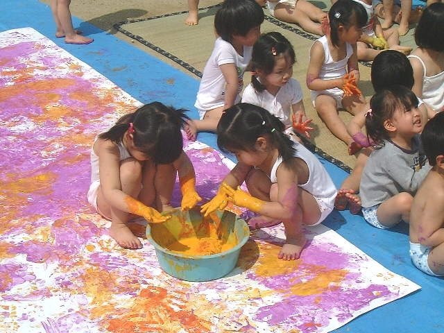 いよいよ年少組のこいのぼり製作の日となりました。前2日の年長さん、年中さんと同じ様に、暑いくらいのよいお天気になりました。1人ずつ手伝いながらやっとこことで、みんなシャツとパンツ姿になり、2列に並んで、ござの道を歩き真っ白い紙の周りに到着しました。簡単な説明をして、早速洗面器に用意したえのぐを子ども達にすすめました。が…気持ちが悪いのか、汚いと思っているのか、あまり乗り気ではありませんでした。そこで、えのぐでぬるぬるになっている私の手で子ども達の手に触れてみました。なにするの!?や、やめてよ!という表情でしたが、慣れてくるとぬるぬるといた感触が気持ちよかったようです。楽しんだ後お部屋に戻ってからは、大変な状態でしたが、「楽しかった」と言いにきてくれる子ども達に、元気をもらいました。来週には今日の「紙」がこいのぼりに変身です。子ども達と楽しみたいと思います。 |