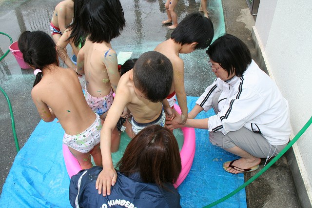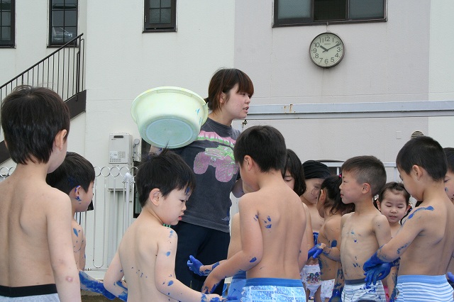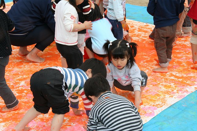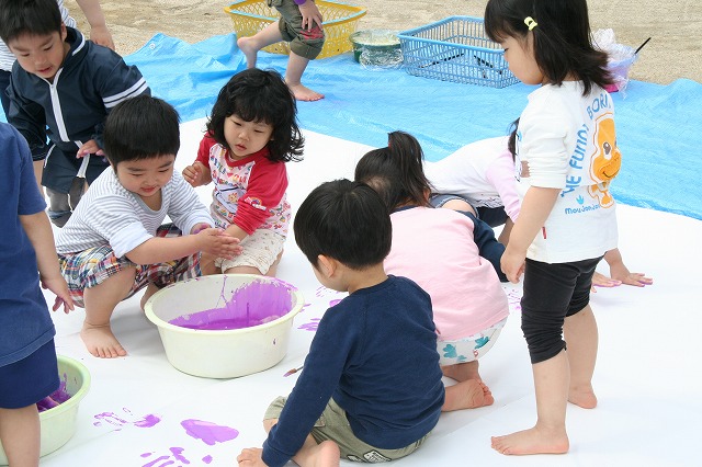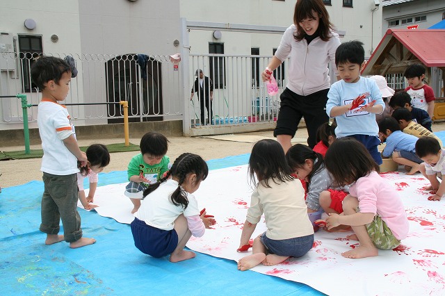 年長さんのこいのぼり製作がありました。バケツにお湯をためていると、先生何してる〜とみんなが集まってきて見ていました。その次にござを用意するのですが、Aくんとばら組のBくんがお手伝いしてくれました。小さい体で一生懸命運んでくれたので、ありがとうと言うと、嬉しかったようで何回も手伝ってくれました。製作もスムーズにすすみさすが年長さんだなぁと思いました。おもいっきり体を使い、子どもたちも全身で楽しさを感じるようでした。 |