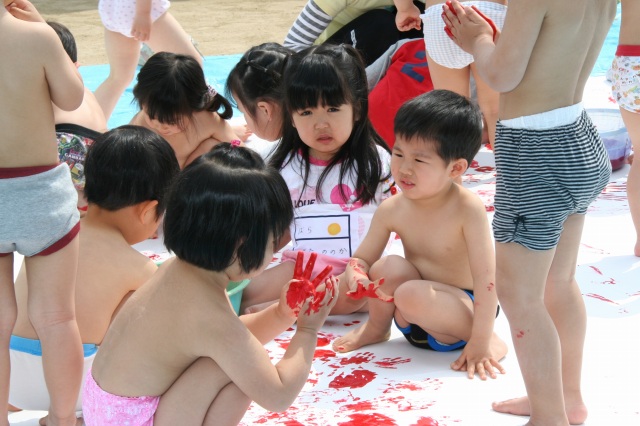 今日は年長さんのこいのぼり製作がありました。とても良い天気でパンツ一丁ででも大丈夫な気候でした。大きな紙にぺたぺたと手足を思い切り使い、製作を楽しんでいました。白い紙があっという間にクラスカラーになりました。体じゅうの絵の具もともだち同士ごしごし洗い面白そうにしていました。年長さんらしいこいのぼり製作だったように思います。 |