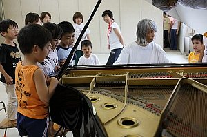 今日は一学期最後のホームクラス。21人の子どもたちでにぎわいました。おやつの後、さくらで遊んでいると、ホールからきれいなピアノの音色が聞こえてきました。何人かの女の子が「先生何か聞こえてくるで」とホールとの境のところに耳をあてて聞いていました。すると扉が開き、ハヤピーが「おいで」と呼んで下さいました。みんなグランドピアノのまわりに集まってウォン・ウィンツァンさんのピアノを聴かせてもらいました。結構静かに聴いてたように思いました。 |