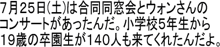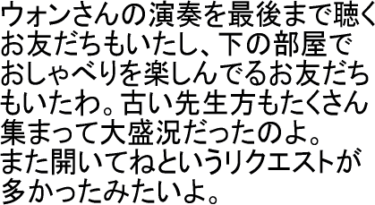 「はたちのかい」の合同同窓会がありました。ウォンさんのピアノコンサートは子どもたちの歓声が聞こえてくる中でラフな感じで行われました。いつも寝る前に聴いている曲を直接聴くことができたのは感動でした。子どもたち(もう大人かな!?)は高2を境にしておしゃれ度がグンとアップし、名前を聞くまで誰かわからないという子も多かったですが、やはり面影が残っていてとても懐かしかったです。私が名前を言い当てると「覚えてくれてたん!?」と驚きの様子で、私のこともわかっていたらしく、お互いに「覚えてくれてたん!?」の再開で、楽しい一日でした。ありがとうございました。 |
