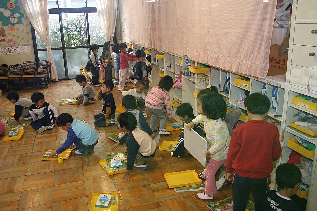 今日は、久しぶりに絵本の名前書きを机を出し全員で書きました。子ども達も、机でする事が小学校のようで好きです。座っている子ども達の姿を見るとこの間の時より、もうすぐ小学生だもんなぁ〜と思います。いつもは名前だけでクラス名は書きませんが、今日は来週に予定している卒園アルバムの表紙にクラス名も書かなければならないので、練習の意味で書きました。名前とクラス名を書き終えたら、本を読んでいていいという事で、順番に3冊書きました。その後、明日、持って帰るように絵本袋に入れる事にしました。一人ずつ絵本袋を取りに来てもらうのですが、その時に「立ったら椅子を机の下に入れて取りに来てくれるかなぁ?」と声をかけました。みんな何で?って顔をしていたので「これは当たり前の事で普通の事なんだよ、お行儀の良い事、礼儀です」と伝えました。すると「わかった」と笑顔になり、みんな名前を呼ばれると、きちんと椅子を机の下に入れて絵本袋を取りに来る事ができました。「わぁ、すごい、かっこいい、お兄ちゃんお姉ちゃんみたい!」と声をかけると少し照れくさそうでした。このように何かのきっかけを使って大切な事を伝えていけばいいなぁ〜と思っています。 |