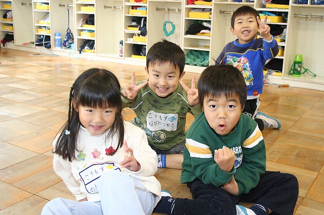 いつものように赤コースのバスを見送ってお部屋に戻ると黄色コースの子ども達が手をつないで円陣をくんでいました。私が「何をしてるの?」と声を掛けても“シーン”頭の中が??でいっぱいになりながら円陣に近づいてのぞき込んでみると…大爆笑してしまいました。それは全員で円になり『にらめっこ』をしていたからです。どの子もすごい顔になっていたのです!!「一番に声を出して笑った人が負けやねんで」とルールを教えてもらい私も参戦しました。驚いたことにどの子も強豪でなかなか笑わないのです。3回して3回とも私が一番に吹き出してしまいました。今まで『にらめっこ』は2人でするものと思い込んでいましたが大勢でやると面白さも倍増するんだなと感じました。誰が思いついたのか分からないのですが、自分たちでルールを決め、遊びをどんどん発展させていく力に改めてびっくりさせられました。クラスのみんなでやったらどうなるかな?一度試してみたいと思います。それにしても子ども達の変な顔はすごい!! |