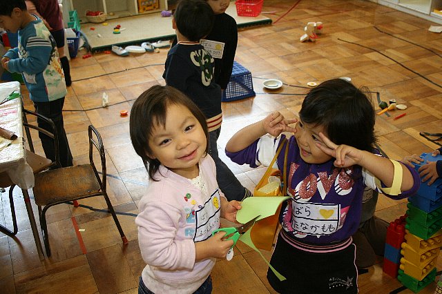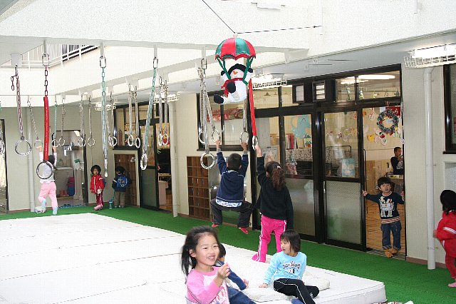 いつもこどもたちがおっとっとを上手にしているのを見て“すごいな〜!!”と思っていて、今日もAちゃんがしているのを見て「Aちゃん、おっとっと上手やね、こわくないの?」と聞くと「全然こわくないよ、先生もやってみたら?」と言われて、私は一回もしたことがなかったので“どうかなぁ〜?”と思いながら少ししてみました。すると以外に出来たんです。ちょっとフラフラでした。その場に佐々木先生も来て、佐々木先生も初めておっとっとっをされたんですが、先生もフラフラで「Aちゃん、どうやったらそんな上手に出来るん?なんかコツ教えてよ〜」と言うと、Aちゃんが「くつ下脱いでみたら!!だってわたし、はだしでやってるもん」と教えてくれました。それで私たちもくつ下を脱いでしてみるとスベリがなくなって、更に上手に出来ました。今日はAちゃんにおっとっとが上手にできるコツを教えてもらいました。 |