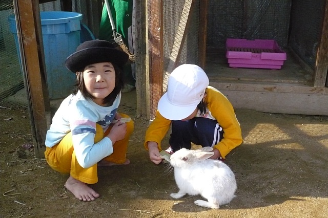 朝の当番が運動場の時は古株のうさぎのちゃーこちゃんを散歩(リハビリ?)させます。どうしてもうさぎを追いかけたり前に行ったりさわったりと、みんながかまうので人気者のちゃーこちゃんなかなか自由に動けません。でも、だんだんと慣れてきて最近はちゃーこちゃんの『自分の行きたいところに行く』心を尊重してくれるようになりました。今日はAちゃんがずっとついて歩いてくれて暖かい日射しの中でレタスも食べました。毛並みもぐっと良くなっています。 |