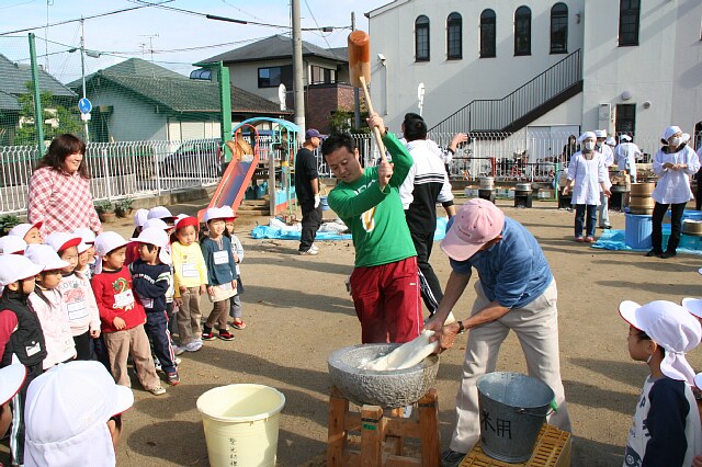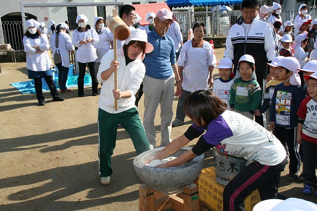 すずらんのお部屋はちょっとお得です。なぜなら、窓が運動場側にいくつかあるので、そとの様子をのぞく事ができるからです。今日はその窓に朝から子どもたちで満員状態です。かわいらしいおしりをいくつも並べながら、「あっ!あれがもち米や!」やら「おすもうさんおったぁー!」やらで、くぎ付けです。そんな様子をハヤピーはどこから感じたのか、タイミングよく内線が鳴り、「準備の様子、外に見に行ってもいいよ」とのことでした。もちろん子どもたちは「行くー!」と帽子を持って準備OKです。行く気満々になっていると、Aくんが「先生、外におる、おすもうさんって朝青龍?」とおもしろい質問をしてきたので「じゃあ、それも確かめに行こう!」と運動場に向かいました。残念ながら朝青龍ではありませんでしたが、子どもたちに見えやすいよう、おもちをついて下さったり、とてもやさしいおすもうさんでした。お米がおもちになるところまで見ることができました。一度部屋に戻って、次はみんなの番です。「ぺったんこ〜それぺったんこ〜」歌いながらつきました。そしてつきたてのやわらかいうちに食べました。おかわりの大行列がなかなか途切れず、クラス委員の方々が大活躍して下さいました。準備から後片付けまでお手伝い下さいました母の会役員・クラス委員の方々に感謝致します。また全体がスムーズに進むよう支えて下さった事務所の先生方、ありがとうございました。 |
