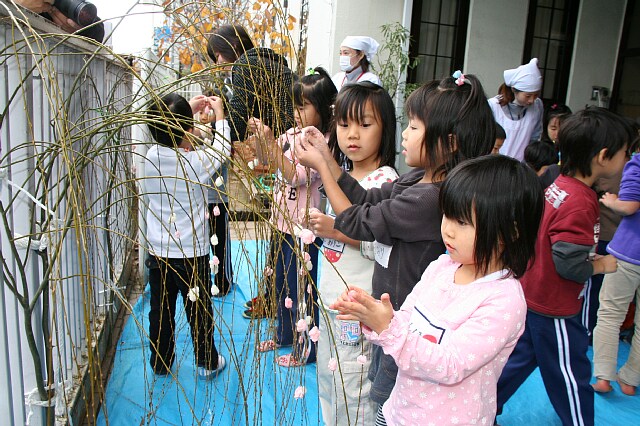 おもちつきがありました。朝はやくから母の会・クラス委員のお母様たちが集まって下さり、みんながとっても楽しみにしていた行事をむかえる事ができました。みんなで作った白とピンクのもち花も今では珍しいものかと思います。こういった昔ながらの行事を続けていく事は子どもたちの経験にもとても大切なことだと思います。 |