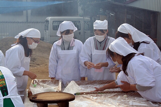 前日の雨はやんだものの、お天気が少し心配な中、12月4日(金)、おもちつきが行われました。前日の準備で、もち米をとぐのをお手伝いしてくれた子どもたちは、とても楽しみにしている様子でした。今年ももちつきの達人村尾さんご夫妻や近大相撲部の学生さん3人をはじめ、元母の会、元クラス委員の方々が、朝早くからお手伝いに来て下さいました。園庭に並べられた、昔ながらの薪で火をおこしたかまどからは、蒸されたもち米のいいにおいがしてきます。しっかりと杵でつかれたおもちは、見るからにおいしそう!大量のおもちでしたが、クラス委員さんが手際よく丸めて下さいました。子どもたちも先生と一緒に順番に杵を持って、おもちつきをしました。自分たちでついたおもちは、格別においしかったのでしょう。おかわりをするクラスもたくさんありました。おなか一杯になった子どもたちは、正門前でお正月飾りの「もち花」を作ったり、ホールでおすもうさんと相撲をとったりと、楽しい一日になりました。この様な日本の伝統的な行事の体験が、心にいつまでも残ってくれればいいなと感じました。クラス委員の皆様には、朝早くからお集まりいただき、本当にありがとうございました。私自身、とても思い出に残るたのしい一日となりました。 |