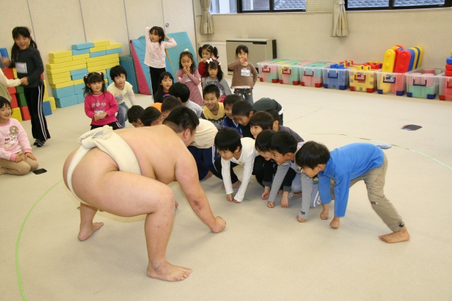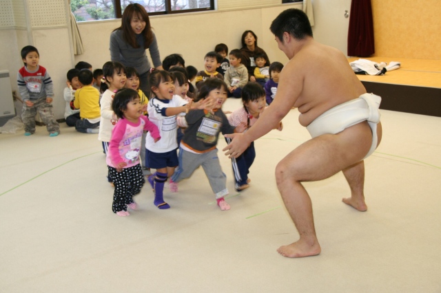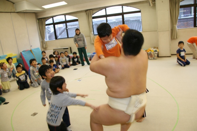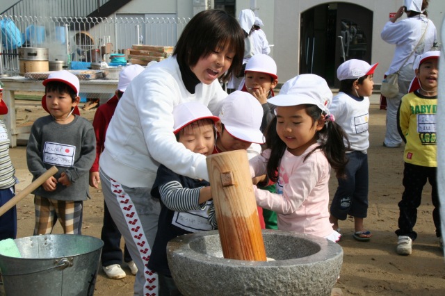 今日はおもちつきでした。登園してきた子どもたちは私が昨日、公開保育の見学でお休みしていたので「先生おはよう!お米きのう洗っといたよ!」と言いにきてくれました。運動場で、もち米が蒸され始めていたり、おすもうさんの姿が見えたりするので「おもちつきやなぁ〜」と嬉しそうでした。おもちをつく時間になったので、運動場に出ると、もち米を蒸しているかまどの火にびっくりしていました。そして蒸されたもち米をみせてもらうと「ごはんみたいや」と昨日洗ったもち米にビックリだったようです。その後、4人ずつ杵を持ってついていきました。嬉しくて仕方がないようで見ている子も「ペッタンコ!ペッタンコ!」と大合唱でした。そしてお部屋に戻ってからは、つきたてのおもちのきなこもち、おしょうゆもち、お雑煮と美味そうにたべていました。大丈夫??という程、おかわりをしていてクラスのおもちプラスおかわり用のきなこもちは完食でした。もう一つの今日のお楽しみはおすもうです。ホールでおすもうをしました。何人かずつと男の子・女の子に分かれて、そして全員でたくさんおすもうをしてもらいました。全勝に大喜びの子どもたちでした。今日は、はじめての楽しい体験がいっぱいで、大満足の一日だったようです。朝早くからお手伝いくださいました保護者の皆様、どうも有難うございました。 |