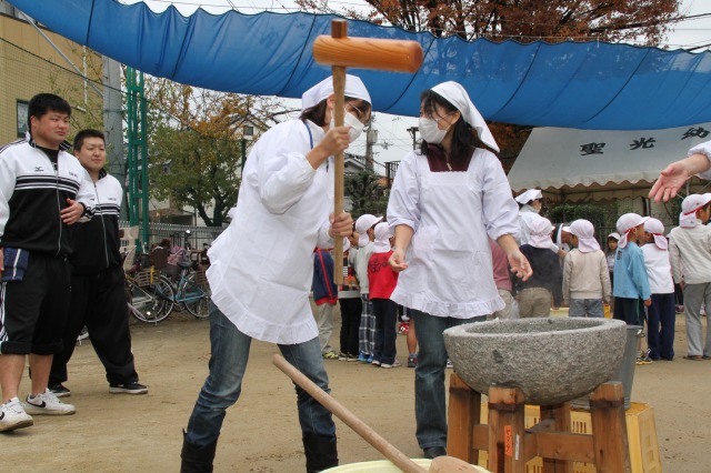 12月に入り、2学期も少なくなりました。先週2日(金)はおもちつきが行われ、前日に道具やもち米を洗いました。子どもたちも小さな手でお米が流れていかない様に一生懸命洗ってくれました。当日天気予報に反し雨が降ることもなく、今年も近大生のおすもうさんたちとおもちをつきました。間近で見ると迫力満点!子どもたちも大興奮でした。朝早くからクラス委員のお母さんたちも手伝って頂き、熱いおもちに大苦戦しながらも愛情たっぷり丸めて下さいました。昔ながらのおもちつきに、おすもうさんが力強くついて下さり、やさしいお母さんの手で作られたおもちは“最高の味”だった事まちがいナシ!です。「おかわりー」との声があちこちから聞こえてくると、前日からの疲れもふっ飛びました。クラス委員さんには朝早くからお手伝い頂きありがとうございました。来年も御協力の程よろしくお願い致します。 |