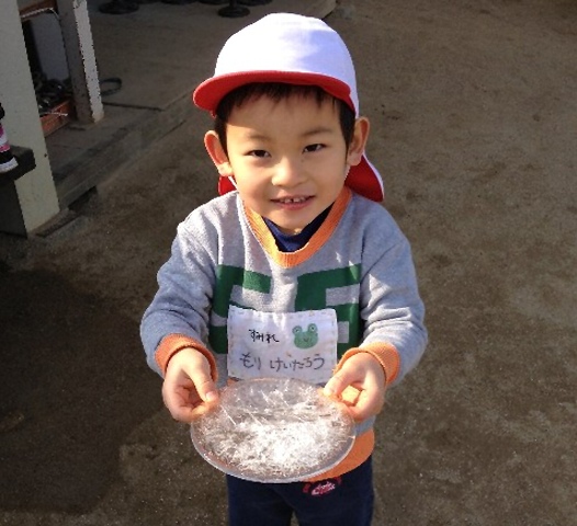 担任が合奏の伴奏に行く間、何をしようかとお弁当の準備の机を出しました。カイトを作ろうと思っていたのですが、机の上ではちょっと無理。で、じゃあと小さい凧を作りました。画用紙に好きな絵を描き細い画用紙をのりで貼りました。お弁当を食べている間に凧ひもをつけました。お弁当を終え、運動場に出て元気に走り回って、とても嬉しそうでした。昨日の帰りも、器に水を張り、朝わくわく登園する子どもたち。氷が出来たのは少しだけ。氷が出来ていなくとも、今日の帰りに「また月曜日に氷できているかな?」といつもは、はにかんでなかなかしゃべってくれないAくんが話しかけてきてくれました。凧は寒い風の中、冷たい空気の中走り、身体を暖かくしてくれます。自然に出来る氷は、電気がなくても冷蔵庫がなくても、できることがすごい!日本の冬を体で感じています。そしてなにより子どもたちが生き生きしています。 |