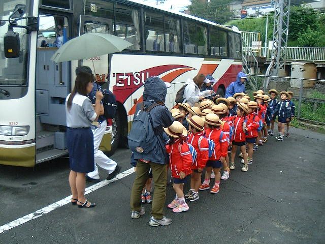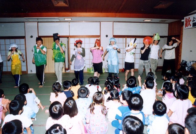 年長の子ども達が楽しみにしていたお泊まり保育の日になりました。お天気が心配ですが子ども達は元気にきてくれました。中にはお母さんと離れるのが淋しいのかすでにウルウルと涙が出てきている子もいました。観光バスに乗り出発しようとした時ぐらいから雨がポツポツと降り、あやめ池遊園地で遊んでいる時もず〜っと降り続きました。なるべく屋根のある所へ移動したりして、乗り物は予定通り楽しむことができました。毎年お弁当を食べさせてもらっている所がちょうどドラえもんの催しをしていてるので、今年は大劇場の中で椅子に座ってお弁当を食べさせてもらいました。毎年かなり暑い時期なのでクーラーのあるお部屋でお弁当をいただく事にしているのですが、今年は雨であまり暑さも感じないので、反対に風邪をひかないようにクーラーを止めてもらいました。お弁当を食べお楽しみのおやつを食べている時、みんなの所をまわっていると「ラムネは2コ、弟にもって帰ってあげる」と袋に入れている子がいて、優しいなぁーと感心してしまいました。食事のあとは大好きなドラえもんを見に行きました。自分達でさわって遊べるように工夫されているので子ども達は大喜び!本当に雨でどうしよう…と思っていたのですが、楽しんでくれている顔を見てホッとしました。遊園地の後はまたバスに乗って山の上の高円山ホテルへ出発しました。ホテルではまず、すずらん組からお風呂に入っていきました。事務所の先生達で体を洗ってあげ、クラスの先生と共に湯舟につかり、すっきりした子ども達です。その後夕食を食べお楽しみのキャンプファイヤーの時間となりました。雨で中止という事になっていたのですが、雨がやみ、外ですることになりました。急いで準備に取りかかり、すっかり用意が出来た頃また雨が降ってきました。しばらく待っていたのですが、この雨ではどうすることも出来ません。今度は大広間での雨バージョンの準備となりました。布団をひいていた大広間を片付けることになり先生達は大忙しです。歌をうたい、ポテトチップス体操、そして担任の先生を美しく変身(?)させるファッションショー。あまりにもおかしな姿に皆で大笑い!これは最高に楽しかったです。最後は先生達の劇“あかずきん”外でする時と違い近くで見れるので、子ども達にもよくわかったのではないでしょうか。途中おもしろいハプニングが何度かあり出番を待っている先生達の方が喜んでいたのでは…と思える劇でした。雨がずっと降っていたので今年の年長さんはかわいそうだなぁーと思っていたのですが、ドラえもんを見たり楽しいファッションショーや劇で反対にラッキーだったのかな?と感じています。途中、熱が出てお迎えにきてもらった子や欠席したお友達がいて少し残念でしたが、無事に帰ってくる事ができ、ほんとうにホッとしました。朝早くからお手伝い下さいましたお母様方ありがとうございました。