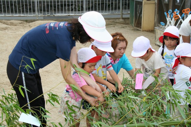 今日は七夕かざりのタコとイカに顔を描き、足をくるくると巻きました。足をくるくるさせると本当に動きが出てかわいくなりました。みんなでびょんびょんと動かし、同じように「タコおどり〜!」と自分たちもタコさんになってみました。子どもたちは「えー!」と言いながらも「タコおどり〜!」と言うとちゃんとタコみたいに動いているのがおかしかったです。 |