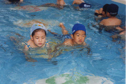 先週の「プール開き」が中止になって以来、この日を楽しみにしていました。朝から「せんせい、きょうはぷーるはいれるな」「おひさま、ぴかぴかしていたよ!」「はやくはいりたいなぁ〜」などと頭の中はプールの事で一杯でした。しかし、こすもす組はプールの時間が一番最後なので製作遊びをして、お弁当の用意をしてからプールに入る予定にしていました。製作をしている時はプールの事を忘れていた様ですが、お弁当の用意をしようとした瞬間、「せんせい、わすれんぼしてるで〜」「プールはいってないやん!」と思い出したかのように、せめられてしまいました。全員がそろってから説明しようと思って机を出し始めただけなのですが、みんなは必死です。そして「プールの順番が最後に遅くなっちゃうから、お弁当の用意だけ先にするね」と伝えると、「あ〜よかった」とホッとしていました。こんなに楽しみにしていたプールあそび。今日はお天気もよくとっても気持ちよく、そして楽しく入る事が出来ました。「でるよ〜!」と言ってもなかなか出たくないようで「ずっとはいっていたいな〜」と惜しんでいる子までいました。 |