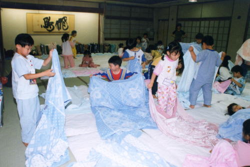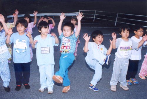 大きい組さんが楽しみにしていた日がやってきました。暑くなりそうなのですが、子ども達と共に楽しみ一緒に喜びたいなぁと思い出発しました。私は小出先生、寺田先生と一緒にすずらん組の付き添いをしました。すずらんさんは昨日、園で「お泊り保育ごっこ」をしていたようで、バスからあやめ池遊園地が見えてくると、「ウワァーすごいジェットコースターや!」「ついたついた!」と大感激。お家から来ている子もいると思うのですが、みんなでこれたという喜びからか、乗り物に乗っても本当に嬉しそうに奇声をあげていました。メリーゴーランド、汽車、コーヒーカップと乗った後はクーラーのお部屋でお弁当を食べました。数年前からこの涼しいお部屋で食べさせてもらえるようになり、ずいぶん楽になりました。おいしいお弁当の後はおやつです。先生たちと相談して今年は3種類のお菓子を袋に入れてもらうことにしました。子ども達もずいぶん喜んで食べてくれました。お昼からはスーパーフライングに乗り、2時過ぎに遊園地を出発してホテルに向かいました。ホテルではまずお風呂です。毎年私が一番楽しみにしているものです。お風呂場に事務所の先生たちが待っていると、パンツ1枚になったすずらん組が入ってきました。みんなどんな所だろう?とキョロキョロ。せっけんで身体を洗ってあげる私と藤先生は水着を着ていたのですが「先生なんで水着きてるん?」「だって裸やったらはずかしいやん」と言うと「ふ〜ん」と不思議そうな顔をしていました。汗をいっぱいかいているので、首や手そして「オッパイをあらいます〜、次はおへそ〜」と言いながら楽しく入浴しました。大広間に帰りパジャマを着て記念写真、そして夕食。身体の大きい子は3回、4回とご飯をおかわりをしてホテルの方が「先生、大丈夫でしょうか?」と心配して聞いてこられました。きっとみんなで食べたご飯が本当においしかったのでしょう。時間はどんどん過ぎて、今日最後のお楽しみ!キャンプファイヤーです。本当にいいお天気に恵まれたので、こうして外ですることができました。不思議な格好ををした火の神様がたいまつを持ってどこからか現れました。神様に火をつけてもらい、歌を唄ったり、面白いポテトチップス体操をしたり、そして先生の「赤ずきんちゃん」の劇を見ました。小出先生の赤ずきんちゃんの所にいろんなキャラクターが出てきます。トーマス、ケロッピー、アンパンマン、バイキンマン、ウルトラマン、そしてこわいオオカミ…「あ!せんせいや」誰がなっているのだろうと…と一生懸命見てくれました。花火で興奮し、サテ!こんな状態で寝てくれるのだろうか…と思っていましたが9時30分頃になるとスースーと寝息が聞こえてきました。今年は途中で熱が出てお迎えに来てもらう子が出て少し残念でしたが、全体的にゆったりといろんな事が進んでいったように感じました。子ども達も担任の先生のお話しをしっかり聞いて落ち着いて自分の事をしていました。こうした事がより一層楽しいお泊り保育になったのだろうと思います。子ども達の朝の移動などで、お手伝い下さいました役員・委員のお母様方、本当にありがとうございました。無事に帰ってこれたことを何よりも嬉しく思います。 |