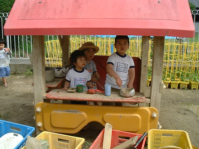 今日は社会見学に出かけられる小林先生に代わって、ピンクコースのバスに乗らせて頂きました。ちょうどピンクコースのあちらこちらに、お祭りの旗が飾られていました。それを年少のAくんが見て「あ〜!はたある!」とまるで宝物を見つけたみたいに、興奮して指差しました。今度はすぐに答えてあげるかの様にBちゃんが、「あれはな、おまつりのやで」と言いました。それを聞いてすぐにCちゃんが、「おまつりわからんのとちゃう?えーとな…たいこ!ほら、ドンドンドンて聞いたことあるやろ?」と、たいこを叩く真似つきでの、説明をしてくれました。なんて機転の早いお姉ちゃん達なんだろう…と大人っぽい話の仕方、しっかりとした説明、それでいてやさしい心遣いがあって…という2人に圧巻でした。 |