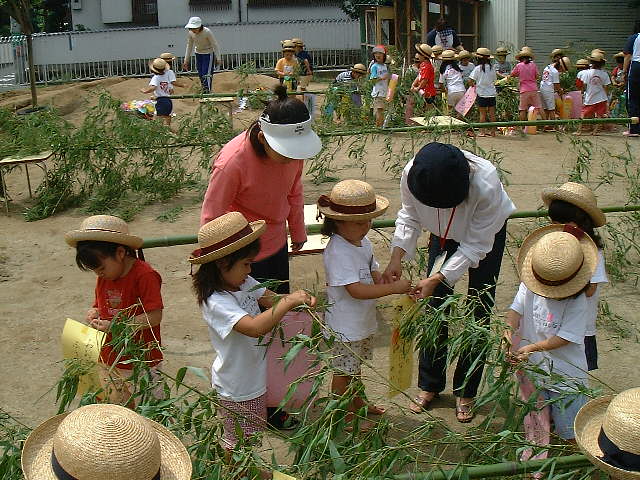 七夕の短冊にお願いごとを書きました。ひらがなを書けない子は私がお手本を渡してあげたり、手を添えたりしながら自分達で書きました。お願い事は、〜屋さんになりたい。〜レンジャーになりたい。〜のせんしゅになりたいというのが多く、子どもらしい夢のある内容でした。宇宙飛行士とか、歌のおねえさんになりたい子もいて、とても楽しそうに見せてもらいました。「〜になれたらいいね」と言葉を掛けると嬉しそうに「うん」とうなずいて、にっこり笑っていました。今日の七夕製作は、なんだか心が温かくなるような気がしました。 |