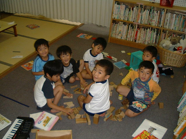 今日は雨が降りました。雨の日は外で遊べないので中庭やホールにみんなドッと集まって遊ぶことになります。今日もホールではサッカーに燃える子、マットで遊ぶ子、紙飛行機を飛ばす子、ブロックでお家を作ってごっこ遊びをする子…といろんな遊びが広がっていました。雨の日に「走っちゃダメ!」と言ってしまうのもかわいそうな気もするし、無理な話なので、ヒートアップ!してきた時に、みんなに集まってもらって「今日は雨が降ってて、お外で遊べないからホールにもいつもよりたくさんのお友達がいるよね。周りのお友達がどんな事して遊んでるかな、とか今はこうしたらちょっと危ないな…とか、ちょっとみんな気にしながら遊ぼうね」と声を掛けました。遊ぶ場所が少なくなってしまう雨の日はこちらも緊張して注意する事が増えてしまいます。できるだけのっている気分を妨げてしまわずにケガの無い様に見守ることは本当に難しいですね。 |