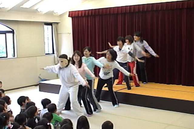 今日は4・5月生まれのお誕生会でした。お誕生会に当たっている子は、朝からそわそわした様子でやって来て、机の上に置いてあるお誕生日バッヂやプレゼントなどをじ〜っとみつめている様子から嬉しさが伝わってきました。ホールでは、ぺープサート「みんなでポン!」をして最後は恒例の(!?)ダンスをしました。今回は新キャラの「肉マン」の登場で、子どもたちもビックリしていた様子でしたが、子どもたちの目は鋭く、戻ってきた瞬間に「肉マン先生やってたやろ〜?!」と問い詰められました。「だって靴下同じやもん!」……やっぱり子どもたちの観察力はすごいです。保護者の方々にも楽しんでもらえたようで、嬉しく思いました。 |
