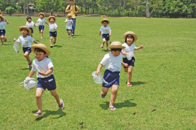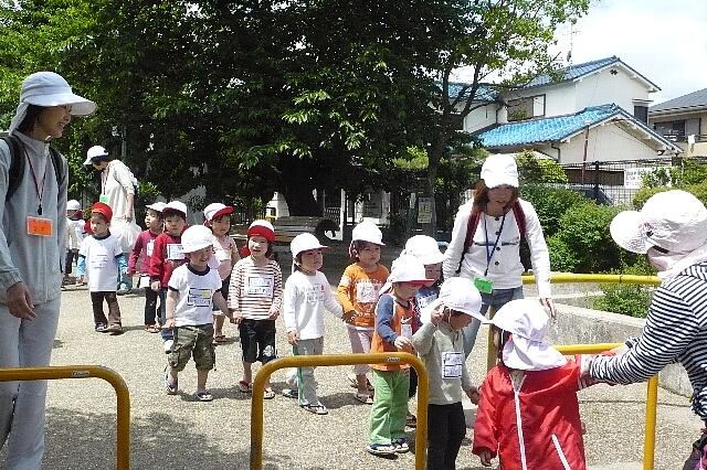 みんなが楽しみにしていた山本公園散歩。暑すぎず、寒くもなく本当に過ごしやすいてんきでした。山本公園まで大人の足でならあっという間ですが、初めて園外を歩くみんなにとっては長い道のり。隣の友だちと手をつなぎ、まっすぐ歩く…と言うのが難しいのです。ちゃんとたどり着くのか心配でしたが、ミサトッコが脱げながらもなんとか予定していた時間よりも早く到着しました。公園では、すでに北山本幼稚園のお友だちが遊んでいて大混雑。大人気の総合遊具は長い列が出来ていました。自分だけ先にすべりたいと割り込みしようとする子が何人かいましたが、「順番だから遊ぼうね}と声を掛けると最後尾に行き、ちゃんと待っていました。砂遊びを楽しむ子も多く、みんな楽しんでくれていたと思います。帰り道はちょっと疲れが出たのか何度か止まって列を修復しなければなりませんでしたが、初めてのお散歩にしてはみんなしっかり歩いてくれました。付き添いで下さった役員さんのおかげで楽しくケガなく過ごすことができました。ありがとうございました。 |