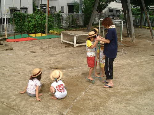 今日はお部屋でおもちゃ体操をしてみました。5・4・3・2・1・0とロケットで始まるのでおもしろかったようです。楽しくノリノリでできるように、私もかなりのオーバーリアクションでしてみると、すごくなりきってしてくれました。なかなか、みんなこの体操が気に入ったようで「もう1回もう1回!」とアンコールの嵐で、3回も続けてしていまいました。私にとって3回連続はちょっぴりきついものがありましたが、1回終わるたびに楽しくて仕方がないという子ども達を見ていると、素敵な汗をかいたなぁと思いました。 |