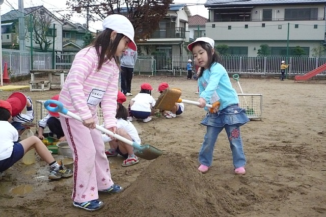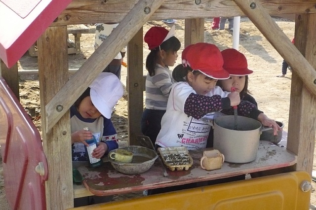 暖かい日で、お外は満員。子ども達はさっそく水遊びをはじめました。穴を掘っては水を入れる。その繰り返しをただ黙々とする。そんな光景を見ながら一人あそびができるのはすごい力だと思えました。他者から与えられたことでなく自分がしたいこと。一見無駄に見える時間と力。そこに子どもの底辺の力がついてきています。そしてそんな一人の力をもっている子に友達が寄ってきます。「入れて〜」そこからまた新しい世界が広がっていきます。小春日和が包んでました。 |