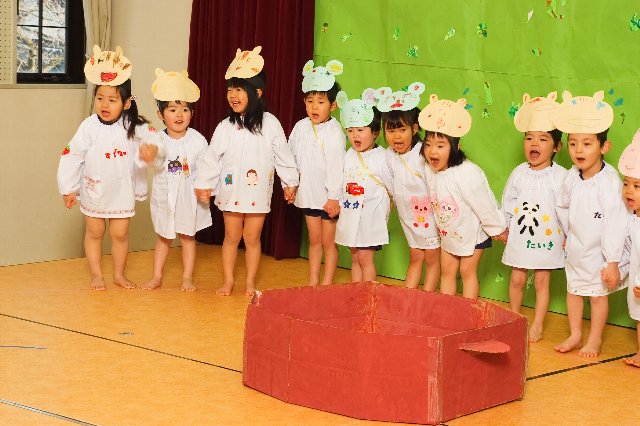 一年の集大成の生活発表会でした。各クラス先生と子どもの個性が、また関係が見事に出ていました。先生も子どもも緊張しやり終えた、すがすがしさ達成感が体中にしみていたと思います。そして今日の一番のお客様である保護者の方々の反応が舞台を一段と盛り上げていました。保護者の方の暖かいまなざあい声援が、子どもたちの頑張りになっていました。見てもらうことがこんなにも子どもたちの励みになるのかと実感しました。生活を子どもの成長を支えているのはやはり親御さんであり、おじいちゃんおばあちゃん、多くの家族の方、その土台があって園での子どもの姿になるのですね。 |