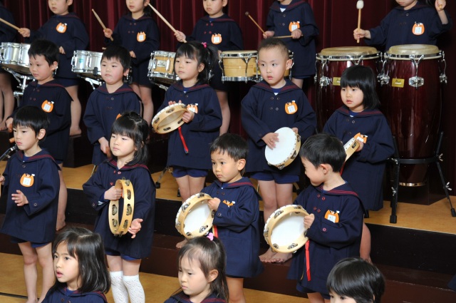 “不安”今年の発表会は私自身も、子どもたちの事をこの言葉がピッタリという状態で、前日を迎えました。しかし、当日の子どもたちの様子を見ると勇気がわいてきました。「ああ〜緊張する〜」「ドッキドキドン!発表会♪」など、いろんな様子で出番を待ちわびる子どもたちに「ぜーったい大丈夫!!」と言い聞かせ(自分にも)出発しました。ホールに入ると、ひまわり組応援団の皆様が暖かい表情で迎えて下さりました。歌では、私のミスにも動じず、堂々と歌いきってくれました。私の視界の隅で、涙をぬぐっている方もいらっしゃいました。こどもたちもその反応に手ごたえを感じたようでした。劇の方は大きな声でいつも通りのひまわり組の姿を見て頂けたのではないかと思います。客席から笑いが起きると、子どもたちも嬉しそうな表情を浮かべていました。そして、最後の合奏です。始まりのリズムがいつもよりビシっと決まり、さっそく涙がこみあげてきてしまいました。しかし、気を取り直し合奏に集中しました。子どもたちは少し保護者の方のほうに気がいっている様なところもあり、リズムがそろわないところもたくさんありましたが、なんと言っても最後がビシーッと決まった事が最高でした。「やっぱり、やればできるやん!!」と、子どもたちの力を改めて感じ、また子どもたち事が大好きになった一日でした。皆様ありがとうございました。 |