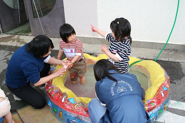 花冷えの中での年少さんのこいのぼり製作でした。服を着たまま絵の具を手足につけていたので、全身絵の具まみれの子はいませんでした。足を洗うのにビニールプールを用意していたのですが、絵の具のお湯の中で泳ごうとする子がいてあわてて起こしました。バケツで手を洗っているとバケツの中につかってしまう子もいて3才児の素直さがとてもかわいく思えました。年長さんになる頃にはこいのぼり製作の意味もわかり、しっかりしてくるかなと思うと楽しみです。 |