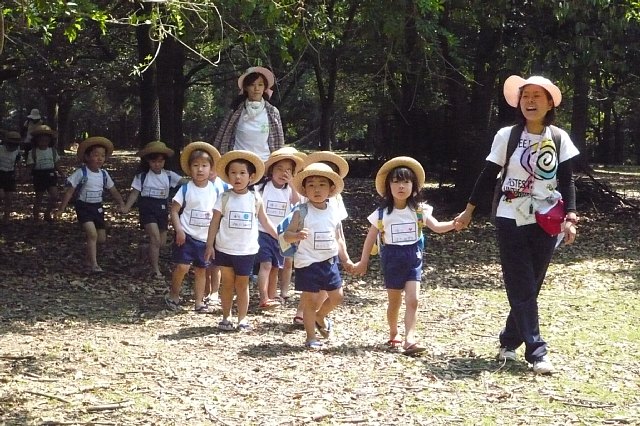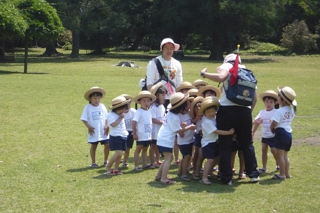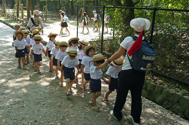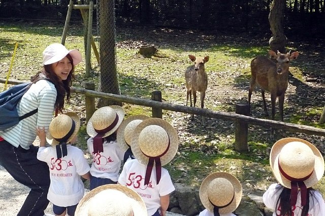 暑いくらいの晴天の一日でした。黄色コースの子はバスに乗るのが初めてと言うこともあり、それだけで十分ワクワクして楽しんでいるようでした。車窓の風景に夢中になっている子や、隣や前後に座っている子とのおしゃべりを楽しんでいる子など色々でした。いつもとは違うバスの席にすわったままでのおうたも新鮮なようで張り切ってうたってくれていました。奈良公園に着いてトイレに行った時に道すがらシカの親子がいたので足を止めてしばらく見物しました。「かわいいね」「小さなツノが生えてるね」などなど私の言葉に子ども達も言葉をくり返しつつ、ただただかわいいまなざしを向けていました。かわいいけどちょっと怖い…けどかわいいというような気持ちだったのでしょうか。そのあと森の中へ散歩して松ぼっくりを拾ったりして過ごしました。何もかも初めての子ども達には全てが発見のようで、何てことない(大人にとっては)場所でもこちらの働きかけ次第では楽しい空間になったようで良かったと思います。ただ食事の後はどの子も暑かったのと歩き疲れのためかちょっとした事で泣くし、、いつも出来ていることでも「できない!」と投げ出してしまうし、歩いてくれないしで、帰りのバスに乗った時はホッとしました。バスの中で一眠りしてまた元気を取り戻した子ども達は満面の笑みでお家の方と帰っていきました。その顔を見て、一日充実していたんだなぁと感じる事が出来ました。 |