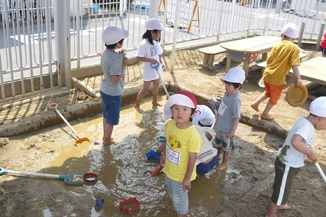 運動場に出ると沢山の子ども達が遊んでいました。あたたかいので水遊びが盛んです。ミサトッコもどろどろなので、脱いでもいいよと声を掛けました。外へ出て遊んでる子はいつもきまった子たちなので、たまには運動場へ遊びに来て欲しいと思います。 |