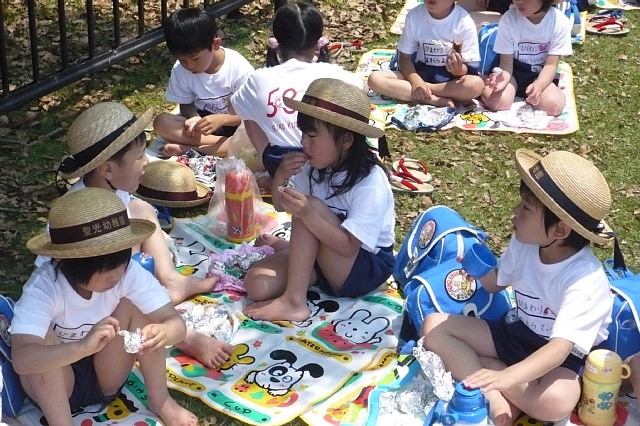 文句なしのお天気で遠足に行くことが出来ました。みんなで幼稚園バスに乗って遠くまで行くこと、奈良公園で遊んだりみんな一緒に青空の下でお弁当を食べること年少のお友達にとっては全てが初めての経験でした。まず、途中でトンネルに入るとみんな大興奮!!拍手が起こったり、キャーキャー言いながらみんなとっても嬉しそうな顔をしていました。トンネルを抜けたり、歌をうたったりしていると、あっと言う間に到着しました。早めに着いたので遊ぶ時間がたくさんあってかけっこをしたり、木のトンネルをくぐったり、松ぼっくりを拾ったり、お散歩をしながら鹿さんを見たり…と楽しい時間を過ごせました。帰りはみんな疲れて寝てしまうだろうなと思いきや、帰りのバスでも子ども達はハイテンションで寝ている子は数えるほどしかいませんでした。子ども達の元気さに圧倒されてしまいました。今日はとても暑かったですがそんな中でも子ども達は頑張って元気に歩いてくれました。幼稚園についてお部屋に戻って、頑張ったみんなへのご褒美に大きい花マルをあげました。今日の遠足で経験した事と一緒にみんなの心のポケットに大事にしまっておいてほしいと思います。今日は母の会の方々をはじめ、役員の方々や付き添って下さった先生方、たくさんの方の協力で、楽しく安全に遠足に行くことができました。本当にありがとうございました。 |
