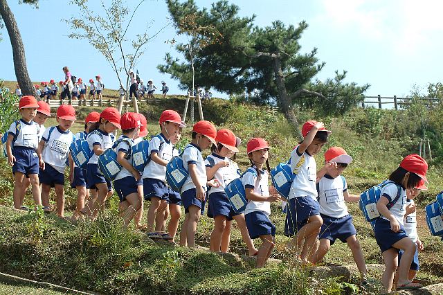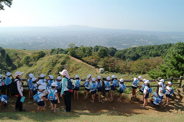 素晴らしい秋晴れの中、若草山の遠足に行くことが出来ました。二年前のコースと違い歩くコースは短いですが、細い道を下っていく事になったので、ケガのないように子ども達にも十分話しておきました。それでも何かあっては…と職員全員で声の掛け合いでした。思ったより子ども達一人ひとりがしっかり歩いてくれたので、大きなトラブルもなく進んでいくことが出来ました。今までとは違い、上から下るのでまず、目の前に綺麗な景色が広がります。その景色を見て子ども達も「すごい〜きれい!」と大喜びでした。そしてその景色を見ながら降りていくと今度は、真っ青な空が広がり、山の緑と少し色づいた葉っぱがなんとも言えない秋の風景でした。「空に届きそう!」という子ども達の気持ちが本当によくわかりました。お弁当を食べてから、虫取りをしたりして、秋の自然を体いっぱいで感じて大満足のようでした。下りも登りも、子ども達の笑顔と「やっほ〜」が響いて、楽しい遠足でした。お休みのお友達がいて残念でしたが、またみんなで、教えてあげよう!と話しました。今年初めてのコースで林先生をはじめ、付き添いの先生方には細かい配慮をしていただいたお蔭で、無事に終える事が出来たと心から感謝します。有難うございます。 |