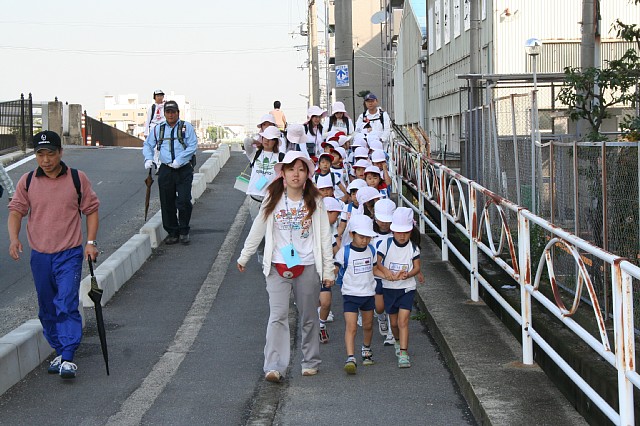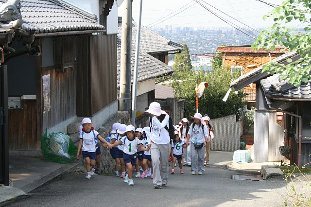 今日は少し肌寒かったですが、秋晴れのお天気の中、十三峠に行く事が出来ました。「幼稚園からず〜っと歩いていくよ!」と言っていたので、朝登園して来た子ども達は「歩けるかな〜?」と少し不安そうでした。でも、歩き出すと色々な道を通るので、楽しく歩けたようです。外環状線を越えてにわとり小屋の所で休憩でお茶とおやつのヨーグレットを食べて少しパワーアップして、山道に入りました。「先生、若草山登ったから大丈夫って言ったけど、若草山の時より坂がずーっと続いて、こっちの方がしんどいやん」とブーイングでした。こんな風に色んな話しをしながら、水呑地蔵の登山口につきました。さあ〜いよいよ自由に歩ける道です。でもここで困った問題が起こりました。ハチ(スズメバチ)がいるとの情報が入りました。だいたいハチのいる場所を教えて頂いていたので、ハヤピーが少し先に見に行って下さり、その場所は2人ずつ、そーっと通りました。それまでの山道では、サワガニと捕ったりドングリを拾ったり、みんな目を輝かせて秋の自然を楽しんでいました。半分歩いた所でカレーです。「めっちゃ、おいしい〜おなかすいたもん!」と大満足でした。あと少しで十三峠までの道は大きな石がゴロゴロ、探検隊になった気分で歩いていました。そしてトンネルをくぐると奈良!子ども達は「やったぁ!!」と喜んでいました。「もう着いたん?」とあっという間に感じていたようです。幼稚園バスが待っている所で全員でバンザ〜イ!!この時はちょっぴりホッとしたようでした。長い時間本当に良く頑張りました。誰一人「しんどい〜」と言う子がいなかったので、凄いなぁと思いました。ハヤピーが「大人になっても奈良まで歩いた!と言う事は覚えておいてね!」と声をかけて下さいました。本当にそう思います。ケガもなく全員無事に帰ってくる事ができて良かったです。林先生をはじめ付き添って下さいました先生方に、心から感謝致します。ありがとうございました。 |