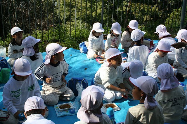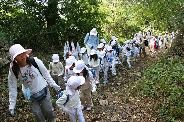少し肌寒い中、十三峠ハイキングがありました。年長さんは誰ひとりとして「しんどい」「まだー」の声がなかったのに驚きました。天候に恵まれたのと、すずめ蜂対策で途中休息が多かったにしても、文句が出なかったのはすごい事だと思いました。蜂の巣を通る時も静かでしたし、沢ガニの川で、おしあいへしあいの満員状態の中でもお友だちを強く押したりする子はなかったように思われます。思い切りカニを捕りどんぐりを拾いとっても楽しそうでした。奈良終点でバンザイをした時は、どの子もきっと達成感を味わっていた事でしょう。ハヤピーが話されたように幼稚園の記憶は薄れ覚えていないことが多いですが、すずめ蜂の恐ろしさゆえの行動、なぜ白い服を着ていたか心の隅に残っていけばいいなぁと思います。 |