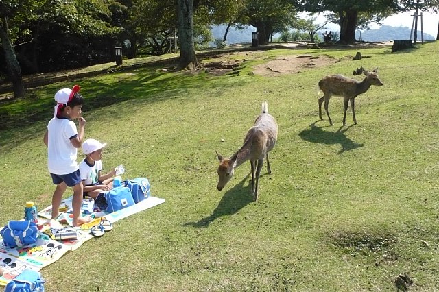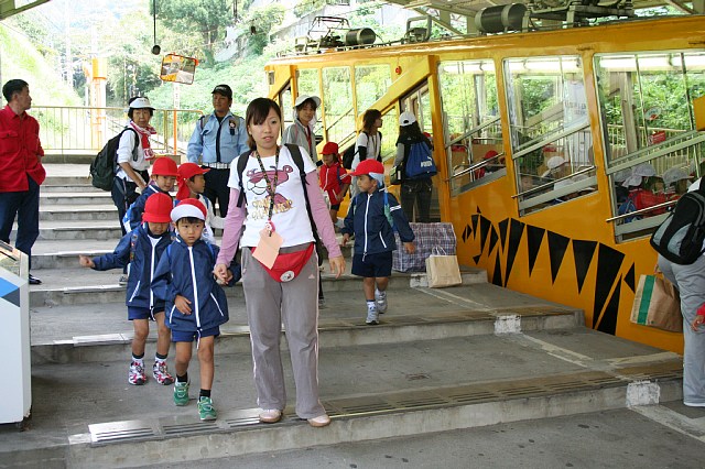 今日は年中さんのケーブルハイキングがありました。ケーブルに乗った途端にみんな喜んでキャッキャッ言っていました。他のお客さんがいてるので、静かにしなさい。小さい声でおしゃべりを。と言ってもみんな嬉しくって出来ません。初めてケーブルに乗る子ばかりで、とっても良い笑顔になっていました。上に着くとすぐに雨がパラパラ、どうなることかと思っていましたが、だんだんと雨もやみ、ドングリ拾いをする事が出来ました。沢山のドングリを拾う子、選んで拾う子といて、見ていておもしろかったです。もうおしまい!と言われてもひたすら拾ってる子もいました。今回はホイル弁当を食べられたので良かったです。遠足とは違った顔を見ることが出来ました。 |