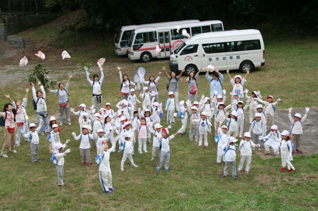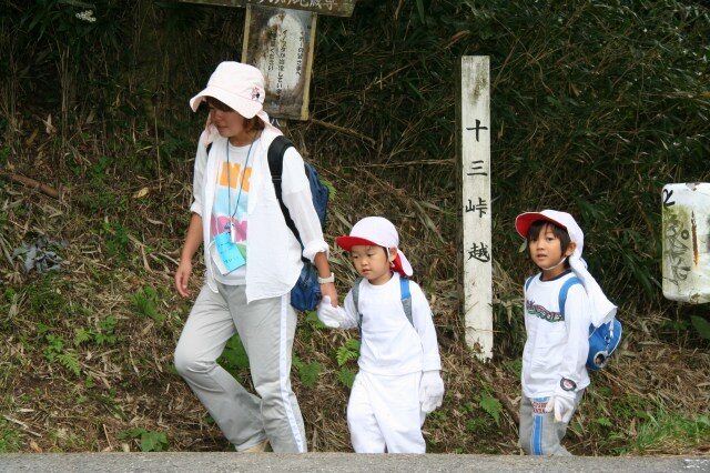今日は年長さんの十三峠越えの日です。昨日の雨もあがり、気温もちょうど良いくらいで、まさに十三峠越え日和でした。元気いっぱいの「エイエイオー!」の掛け声をして園を出発して、いつもはバスで通る道や、お友だちの住むお家の近くを通ったり、お家の人が働いている所も通って、長い長ーーーい道のりを自分達の足で歩いていきます。山道に入る前から「疲れたー」「もう半分くらいきた?」という声が、ちらほら聞こえて少し心配もしていたのですが…。山道に入ると今までの言葉がウソのようにドングリ拾いや、虫、サワガニ探しに夢中になっていました。山の中には幼稚園では見ることのできない発見が盛り沢山で、子どもたちは飽きることなく、袋を片手にキョロキョロと宝物探しをしていました。急な登り坂や足場の悪い細道を越えて、子どもたちは自分達の足だけで奈良県までやってきました。大人でも簡単にできる事ではないのに、子どもたちは本当によく頑張ったと思います。バスに乗る前に、みんなでバンザイと、「おめでとう」を言ってハグをしました。ここは短い文章でしか綴れませんが、長い道のりを自分たちの力で最後まで歩ききった子どもたちは、また大きくなった事と思います。お家の人へ、お話とお山で拾ったお土産を渡してくれた事でしょう。沢山褒めてあげて欲しいと思います。お手伝いして下さった母の会の皆様、ご協力いただいた保護者の皆様ありがとうございました。 |