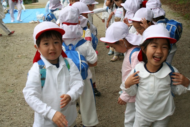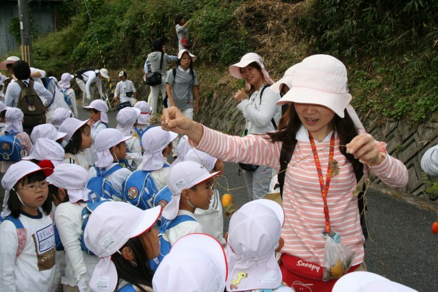暑くもなく、寒くもなくいいお天気だったので、歩きやすくて子どもたちも疲れにくかったんじゃないかと思います。山道に入るまでは信号や車の往来で気をつかうし、止まったり進んだり走ったりで「まだ?」と言う子が何人かいましたが、お茶やラムネで休憩したりして気を紛らわしながらも結構スタスタといいペースで歩いてくれました。山道に入ってからは、少ないと心配していたドングリも思ったより、落ちていて広いながら楽しんで歩いたようです。自分のペースで自由に歩いていいので、私は後ろの方のゆっくりな子どもたちと歩いていたのですが、「先生〜!こっち来て〜!」「先生〜!こっち見て〜!」と前の方を歩いていた子がわざわざ逆戻りしてきて、私を呼んでくれました。何かと思ってついて行くと、ドングリが2つくっついているのや、カマキリなどでした。その発見を私に知らせたくて、わざわざ坂道を登ったのに、また降りてきてくれたのかと思うと、かわいらしいなぁと思いました。その他にもいつもはのんびりしているAちゃんなのにサワガニ探しの川で、「川に入りたい子は、先生の横にくつを脱いでこっちおいで〜」と先に立って待っていると一番に用意して、言ってないのにきっちりとズボンの裾を折り上げて来たり(他の子は「くつ下どこにおいとくん?」とか言ってモタモタしているところだったのに)おしとやかなBちゃんが川に入ると足場の石を確かめながら(足でグイグイ石を押してから)ズンズン進んできて、「岩の下にカニ隠れてるで」という声を聞くや否やガシッと大きい石をわしづかみにしてカニを探し続けたりする姿があったり、。いつもは見られない一面を発見できました。昼食のカレーの後の細い道が続くところでは遠足に引き続き『一列ピーになってる〜!』状態で上手に登っていて、すずらんさんなかなかやなぁと頼もしく思ったりもしました。十三峠を越えたあとはさすがに足が疲れてきたようで、転ぶ子がいたり足が痛いという子もチラホラいましたが、付き添いの先生方が楽しく声かけして下さったようで、気分が変わり、また頑張って歩いていたようです。そして一番最後まで歩いて一番のおいしいところはしっかり、近岡先生がさらっていき、大笑いの渦で〆括って、園へのバスの道中となりました。発熱で参加できなかったCちゃんは残念でしたが、おみやげを一緒に子どもたちも拾ってくれ、また無事に楽しんでこれたのでホッとしています。たくさんの先生方に見守られ楽しませてもらって頑張れたところもあるんじゃないかなと思い感謝です。ありがとうございました。 |