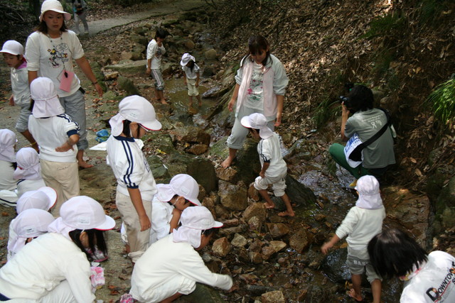 心配されていた雨も降らず、長袖を着ていると、少し汗ばむ程の天気の中、無事に十三峠ハイキングを終えることができました。朝、登園してきた子どもたちは、いつも通りホワイトボードを見ながら荷物のチェックをします。今までハイキング、遠足、何度もやってきているので、手慣れたもの。こういう時に、改めて年長らしさを感じます。準備万端で「エイエイオー!」をして出発。まずは外環より向こうのあるニワトリ小屋を目指します。自分の家の近くを通る子もいて「ここ行ったら○○のおうちや!」と張り切っていたのですが…。外環あたりに「ニワトリ小屋まだ〜!?のどかわいた〜」などの弱音がたくさん聞こえてきました。そしてやっとニワトリ小屋に着くと、そこでは“休憩”が待っていました。お茶を飲み、ラムネを食べると元気回復!とってもわかりやすい子どもたちです。そこからはひたすら坂道…。そんな中でも道端の草花や虫、後ろに見える八尾の景色をみたりと、いろんなものを見つけながら歩いていました。一人では絶対に歩けない、みんなと一緒だからこんなに楽しい発見が出来るんだろうなーと感じました。そしていよいよ山の入り口です。みんな白い服に着替え、ハチの合図もバッチリです。ハチの存在を少し怖がる子もいましたが、それぐらいの危機感を持っていないといけません。いくつかの約束を聞く事の子どもたちの表情は真剣でした。サワガニ捕りの付近や、その他もいくつかのハチポイントがありましたが、とっても良く約束を守り、気をつけて歩いてくれた子どもたちのおかげで、無事に登りきることができました。ドングリが少なく、自由に歩く事も少なかったのですが、カラスウリを見つけて喜んだり、サワガニを捕ったり、ヤッホーを言ったり、ヤクルト飲みたーいと叫んだり…子どもたちの嬉しそうな顔がたくさん見られました。やっぱり一番大喜びだったのは…カレー!「おかわり!!」のオンパレードで、まるで「早食い・大食い大会見たいやね」と先生達も笑っていました。白い服を黄色く汚して帰った子もたくさんいましたが、いい思い出といてうっすらとシミを残しておかれるのもいいかもしれませんね…。みんなで歩いた十三峠。本当にあっという間に時間が過ぎていったように感じます。付き添って頂いた先生方も「誰も嫌って言わずに、頑張ってたな〜。登りやすかったわ〜」と言ってました。最後になりましたが、子どもの帰りを首をなが〜〜くして待っておられた保護者の皆様、今回も子どもたちをベストの状態で送り出して頂き、ありがとうございました。そして、最高の笑顔で子どもたちを褒めて下さりありがとうございました。 |