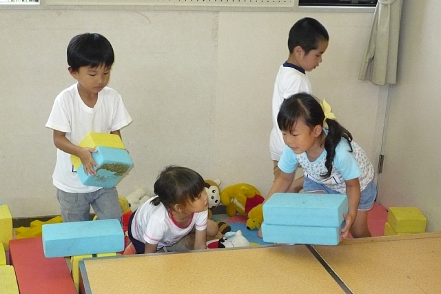 明日は秋の遠足です。昨日のお手紙で雨の場合は行き先を“海遊館”になるという事をお知らせしました。この事を知った子ども達は大仏殿より海遊館にみんなで行きたいという子がほとんどで、朝登園してくると「明日、お天気やねんて〜海遊館に行きたかったのに〜」という声を何度も聞きました。子ども達にとってはとてもわかりやすい魚を見るという方が良いのかもしれません。しかし大仏様も興味をもって見るとおもしろい!という事を伝えようと思い、大仏様がどんな風になっているかよく見て欲しい所をいくつか言いました。「大仏様は立っているか?」「もし座っているのだったら、どんな座り方か?」「何かの花の上に座っているのか、立っているのか?」「どんな手」「目は開いているか、閉じているか?」など、少しクイズ形式で伝えました。すると「え〜、どんなんかなぁ〜」「大きな目で見るわ!」とみんな興味を示してくれました。大仏様だけではなく東大寺の扉や柱の大きさなどもよく見て欲しいと伝えました。日本の文化を伝えるという難しい事ではなく、少しでも興味関心を持って子ども達なりに何かを感じてくれれば良いなぁ〜と思っています。 |