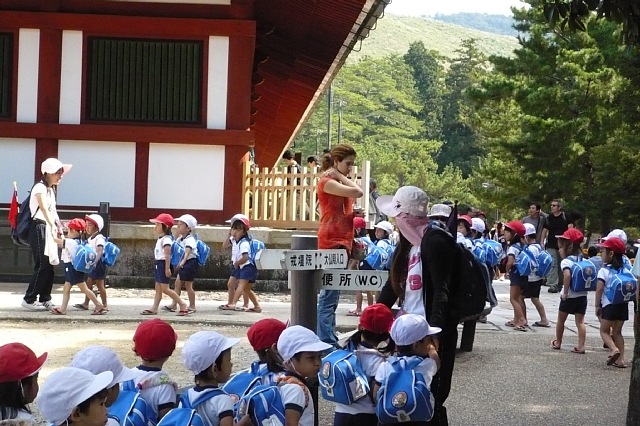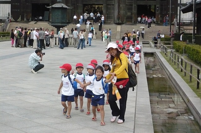 すがすがしい秋晴れというよりも少し暑いくらいの晴天の中の遠足となりました。今日の遠足はいつもとは違って、たくさんの人がいる中を歩きました。途中で列を横切られたり鹿に近づかれて列からはみ出て逃げたり、たくさんの鹿たちにかこまれたり…。なかなかスムーズに進んでいくことができませんでしたが、子ども達は色んな人たちに声を掛けられて、とっても嬉しそうでした。大仏殿の中では大きな大仏さんに圧倒されながらも、色んな発見をしました。大仏さんの頭やお顔やポーズのこと、大仏さんの周りにあるものまでじっくり見て発見したことはたくさん。大仏さんの鼻の穴の大きさと同じと言われる、柱のトンネルも一人ずつくぐることができました。みんな自分の力でくぐることできたので、かしこくなったのではないでしょうか!?。人にもまれ、鹿にももまれ最後まで頑張った遠足。子ども達にはどのような印象が残ったのでしょう。みんなおうちに帰って一度は大仏さんになりきってお話してるのではないでしょうか…。 |