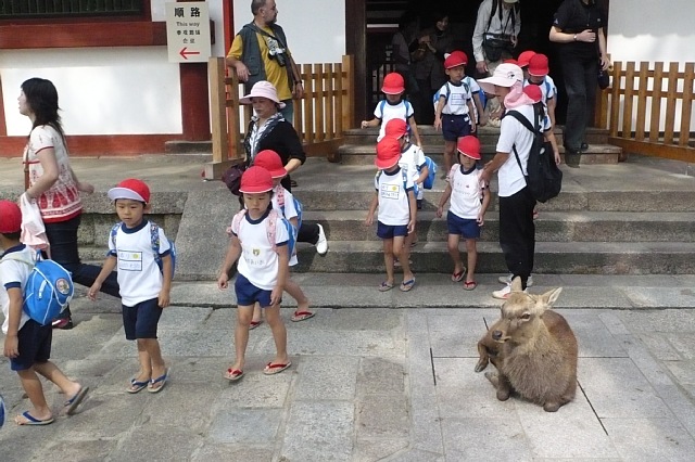 今日は奈良まで大仏さんを見に、遠足へ行きました。行く前に大仏さんの絵本をみてもらいましたが、おおきさは伝わらず「すっごい大きいねんで」とだけ伝えました。すると「とうもとせんせいより大きい?」「ぞうより大きい?」と気になるすみれ組さん。「とにかく幼稚園より大きい!!」と言うと「えー!!?」とびっくりしていました。奈良公園に着くと、早く大仏見たい見たい!一心でずんずん大仏殿まで歩きました。人ごみをぬけ「キャー!!かわいい!!(すみれ組さんのみんなを見て)」と歓声をあびせられ、パパラッチのように写真を撮られ、ダイアナさんの気持ち、ちょっと解るわと思いながら、小さなみんなを見失わないよう「こっちこっち〜〜すみれさんついてきてね〜!」とずっと声を出していました。やっとこさ、大仏さんの前に来ました。首を真上にあげ、口をポカーンとあけて大仏さんを見ているすみれ組さん。きっと想像していた以上の大きさだったのだろうと思います。ぐるりと大仏さんを一周まわり、お弁当を食べに広場へ行きました。広場にはどんぐりが落ちていて「どんぐり拾ったん?」と見せてもらうと、手のひらには鹿のうんこがありました…。確かに似ています…。でも、うんこのお持ち帰りは控えてもらいました。