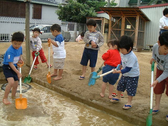 | 4月15日(月) すずらん組クラス日誌・住田 今日はお天気がとても良くて暑かったです。運動場では早くも水遊び!とびっくりしました。新入園児さんがダイナミックに水遊びを繰り広げていて、式服もぞうりもびしょぬれでした。でもとても気持ち良さそうで「お水気持ちいい?」と聞くと「うん!」と楽しそうな笑顔がかえってきました。 |