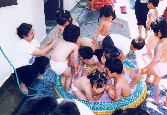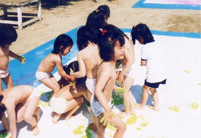 今日はこいのぼり製作日。太陽が空で輝き、とても良いお天気の中でする事ができました。少し照れながら子ども達はパンツ一枚の姿に…。でも外へやりに行くよ!という頃には、そんな事はもう気にはならなくなっていて、今からやる事への期待で一杯という感じでした。外へ出て大きな模造紙を見てとても嬉しそうにしていました。まずはすずらん組の黄緑色からです。みんな一斉に絵の具の所へかけ出し、手につけペタペタ始めました。そしてすぐ足にもつけ始め大喜びです。みんなとっても楽しくのびのびとやっているのですが、色のついていない面もあちらこちらと残っていて、「こっちもして〜!!」と私は必死に声をかけていました。そんなすずらんの様子をみて奥村先生が来て下さり、みんなのために応援歌を歌って下さいました。また、私とカエル競争をして端から端までペタペタしたりしました。2色目は黄色、3色目はオレンジです。みんなでワイワイ大騒ぎしながら楽しくする事が出来ました。そして気が付けば体中のあちこちに絵の具がついていました。絵の具が乾いて「パリパリや〜」とそれもまた子ども達は楽しんでいました。年少の頃など泣いて汚れるのがいや〜と言う子もいてたのに…。と思うと体中絵の具だらけの子ども達は本当にたくましくなったなと思いました。
