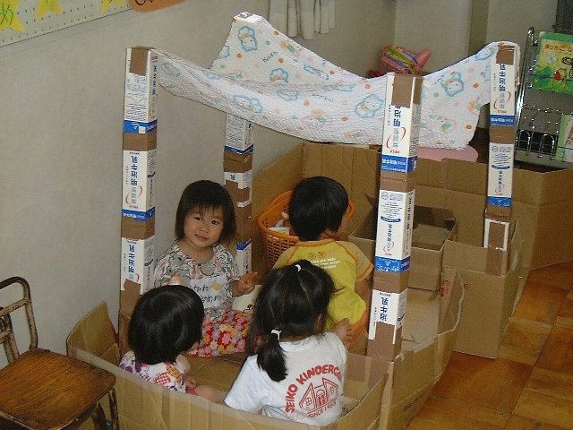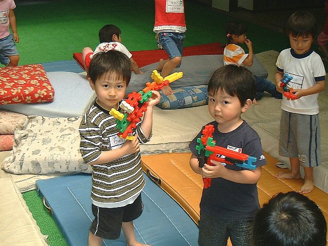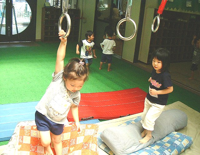 今日は雨の日だったので、ホールで子ども達を見ていました。以前から在園の子ども達は、ホールでも遊び慣れているので入ってくるなり、それぞれ好きなおもちゃで遊び始めました。新入の子ども達は、あまり慣れていないのでどうなるのかな?と思って様子を見ていました。すると何も心配には及ばず、どの子もあたり前のようにホールでの遊びの中に入っていったので、子ども達は割とこんなものかと安心しました。 |