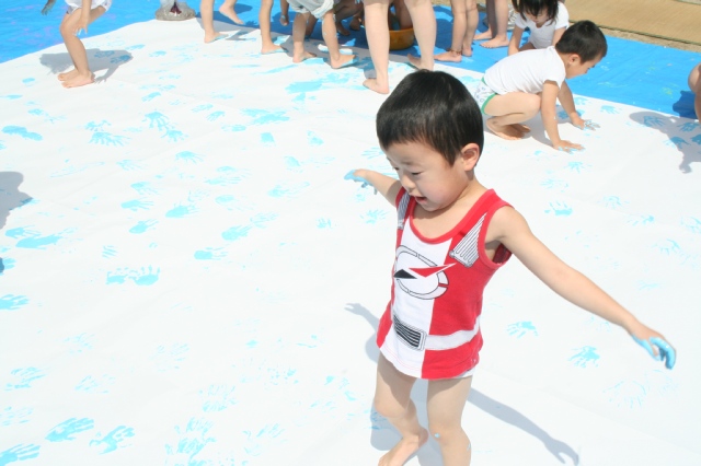 お弁当のあと運動場で遊んでいたのですが、女の子たちはおうちのところでままごとを、AくんとBくんは網をもってハエのような虫を捕まえたりして、Cくん・Dくん・Eくんは山のところで泥遊び。山の頂上がクレーターのようにへこんでいるので、そこに水を入れ湖のようにして遊んでいたのですが、Cくんが足を滑らせ水の中に少しはまってしまいました。ホールに戻るころにはDくんもTシャツが濡れてしまい、おやつの前に2人とも着替えました。おやつの後はEくんは黙々と細い画用紙の切れ端で何か作ってましたが、CくんとDくんはマットを使って汗をかくぐらい遊んでいました。本当によく遊んでました。 |