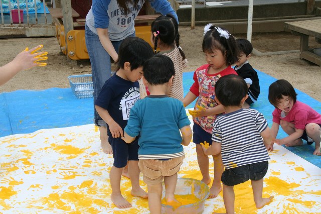 年長さんのこいのぼり製作がありました。バケツにお湯をためていると、先生何してる〜とみんなが集まってきて見ていました。その次にござを用意するのですが、Aくんとばら組のBくんがお手伝いしてくれました。小さい体で一生懸命運んでくれたので、ありがとうと言うと、嬉しかったようで何回も手伝ってくれました。製作もスムーズにすすみさすが年長さんだなぁと思いました。おもいっきり体を使い、子どもたちも全身で楽しさを感じるようでした。 |