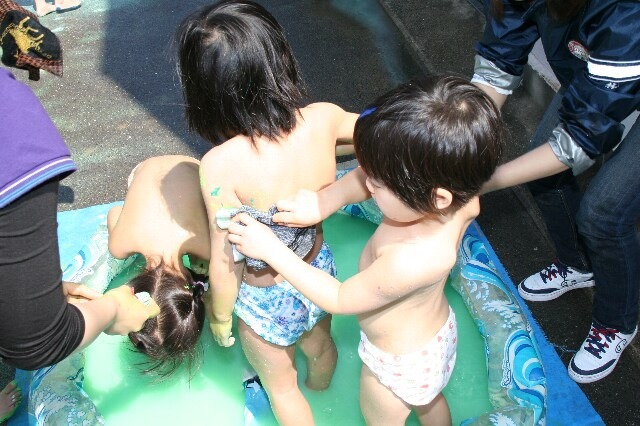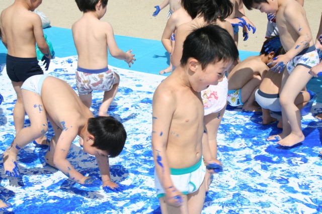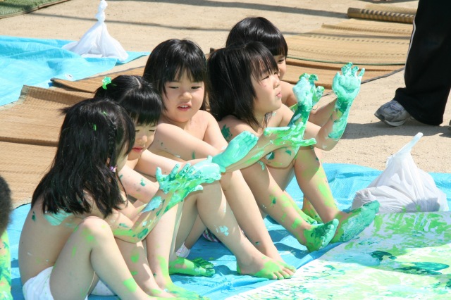 今日は年長さんのこいのぼり製作がありました。とても良い天気でパンツ一丁ででも大丈夫な気候でした。大きな紙にぺたぺたと手足を思い切り使い、製作を楽しんでいました。白い紙があっという間にクラスカラーになりました。体じゅうの絵の具もともだち同士ごしごし洗い面白そうにしていました。年長さんらしいこいのぼり製作だったように思います。 |